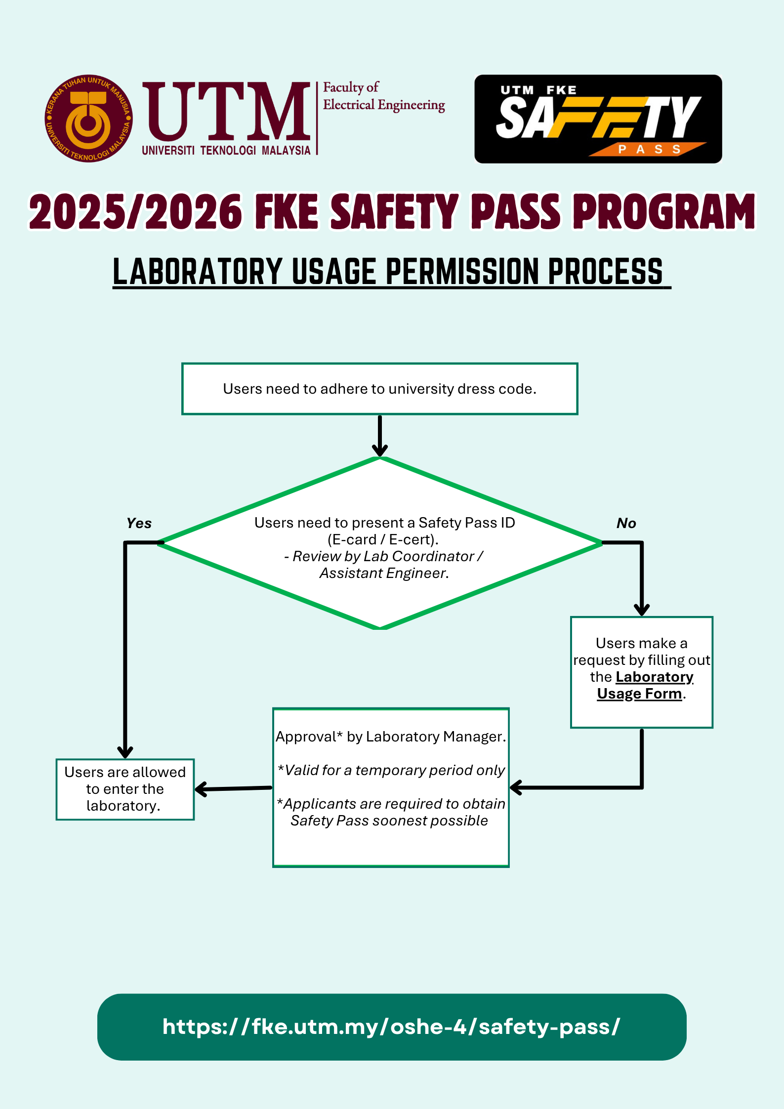 FKE Safety Pass Card is a mandatory for all lab users* before entering and using any facilities in the FKE laboratories