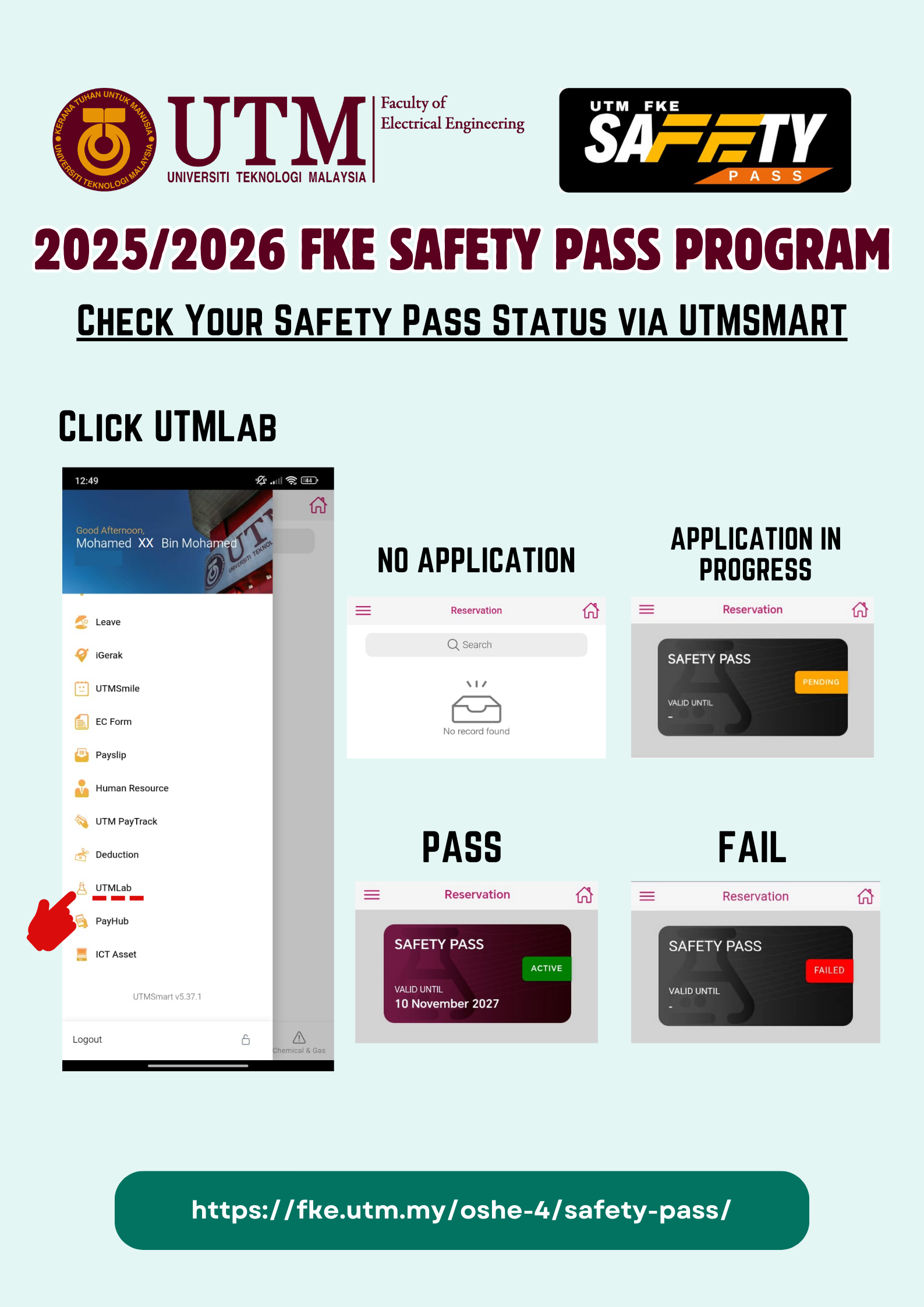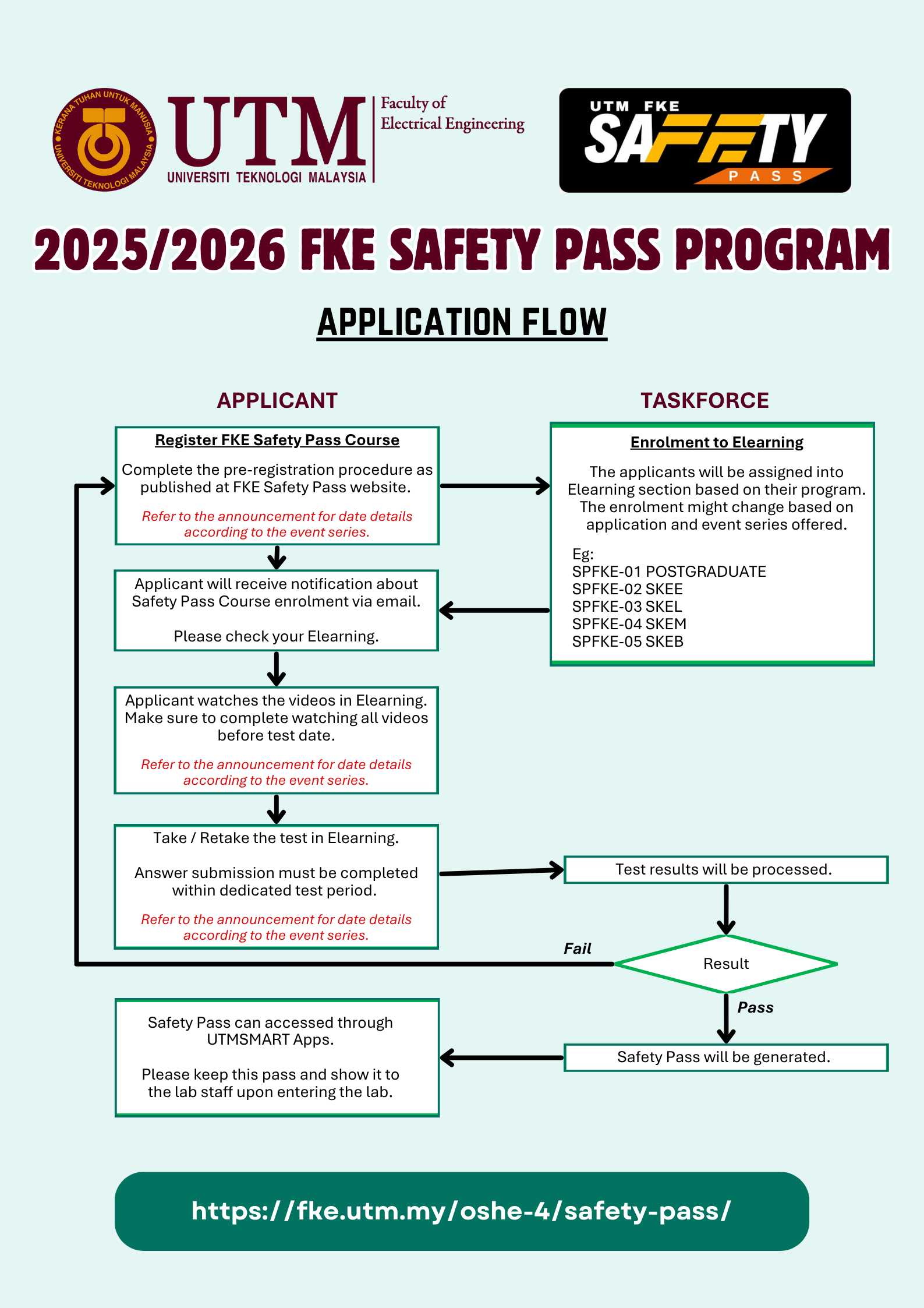 After verification by the assessor, participants can check their result status within two weeks of completing the FKE Safety Pass Test via the official website (for 2024/2025 session) or UTMSMART (for 2025/2026 session onwards).