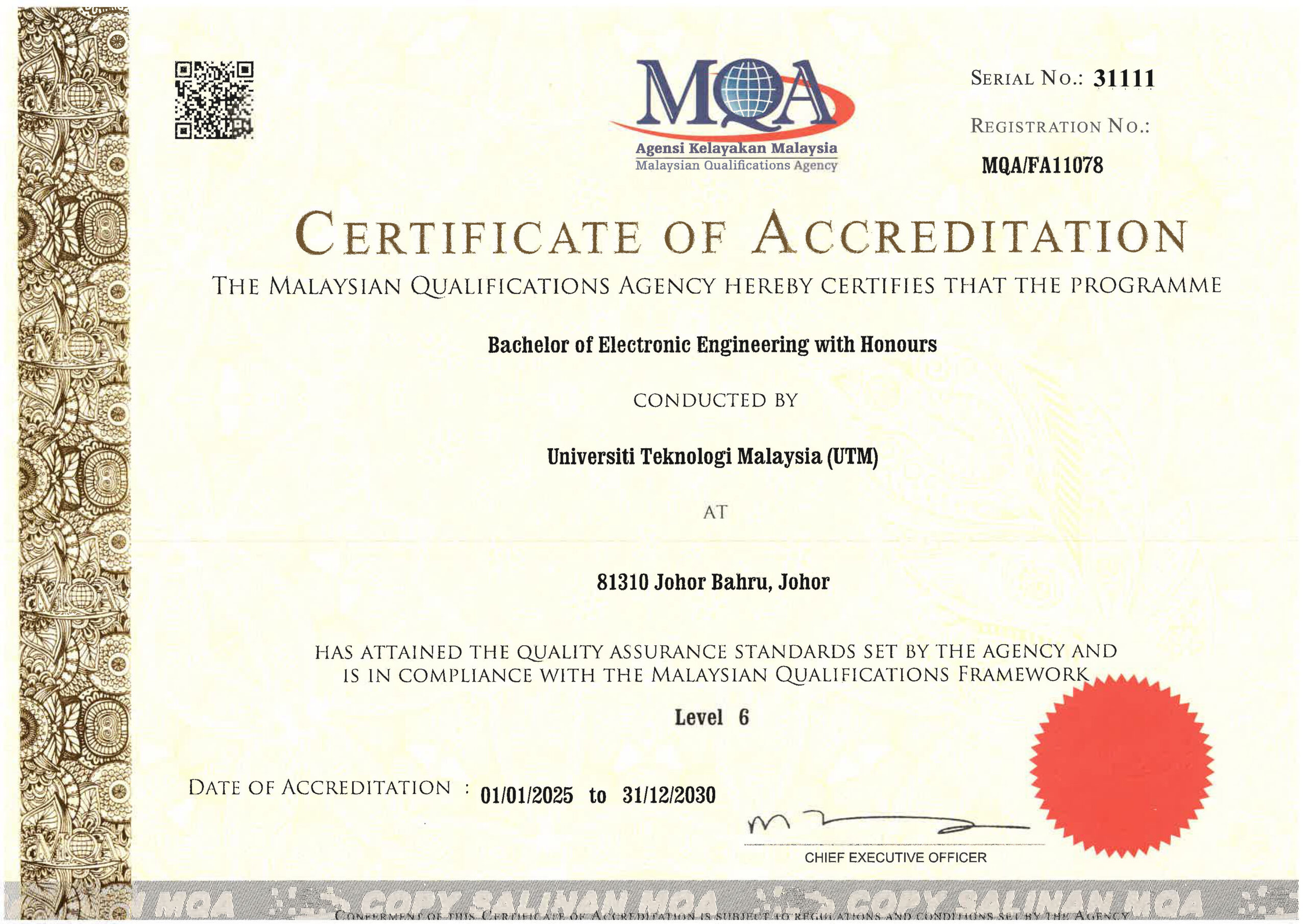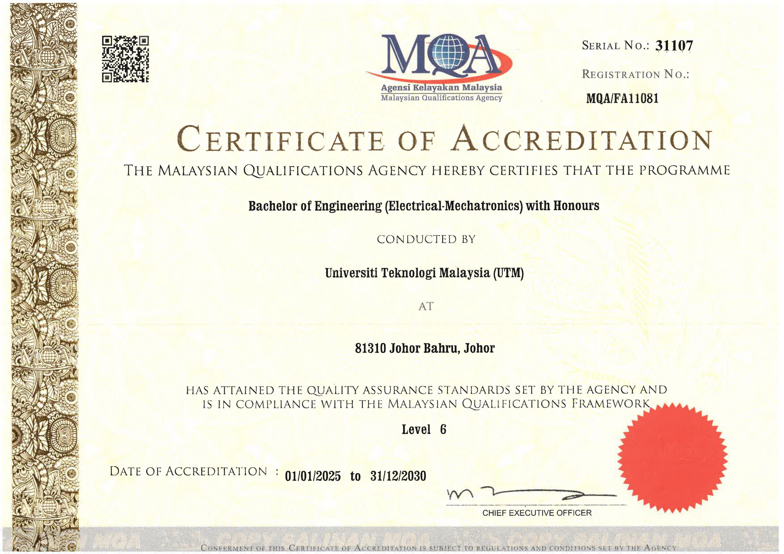 Bachelor of Engineering (Electrical-Mechatronic) is a program with honours that has been established and offered for more than two decades by UTM. The program is a four-year program completed with one year final year project.